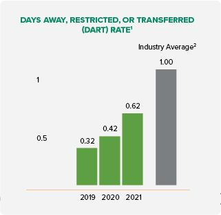 2 Graphs depict S&C's TCIR and DART performance from 2021 in comparison to industry averages for TCIR and DART. These industry averages were sourced from 2020 U.S. Department of Labor NAICS statistics.